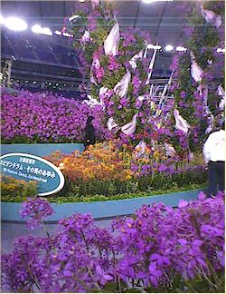In the centre is a white tower where individual trophy winners are placed. Right at the front is an exhibit by the Japan Orchid Growers Association (JOGA). The one with the globe in the centre. We'll take a closer look a that. Sales are towards the top left, and individual plant entries over to the right The camera has only captured the main part of the show-it really is quite big.