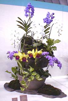 Stunning! ...and a surprising number of plants and colors used...not traditional Ikebana. How were the two vandaceous plants secured to the arrangement, upper right?