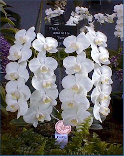 OK. We're about halfway through. Here is a beautifully flowered amabilis. A small plant and well bloomed. What I liked was the way they were staked to cascade like a waterfall unlike the traditional arch here. Almost all the phals were staked like this, including the ones I saw in shops for sale. I rather like it. The phal's clonal name is 'Super AMA' and it was awarded a bronze medal (equiv to an HCC)