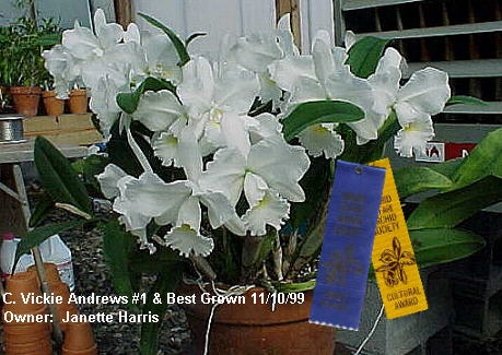 I want to share some of the C. Vickie Andrews story with you. "I bought it at an auction in March 98 for $9. ...The plant was in bad shape...a lot of leaves missing, some burned and dehydrated..I brought it home and..." It now has 32 blooms which is a real accomplishment for the grower.