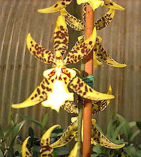 A relative newcomer to the clan, purchased at the 1996 Southwest Regional Orchid Growers Assn. show in Fort Worth. It makes a lovely spray at least a yard long which I feel looks best staked. It boasts a dozen or more strikingly marked golden flowers about three inches wide. This brassidium seems to appreciate the slotted clay pot/charcoal mix treatment.