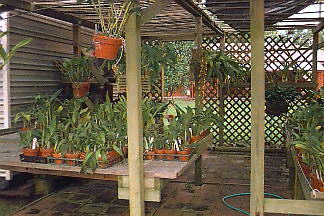 The lathhouse is 18 x 18, two inch laths with one inch spaces on the left side only; the right side shares the 60% shadecloth covering the greenhouse so that lath was removed to allow all the Louisiana sunshine the plants can take.