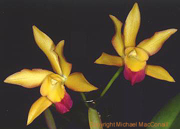 cherry red and smelled of apricots so the name came readily. Several of the grex were splash-petalled, either purple on pink or on pale yellow but these were all quite small flowers. Later blooming clones were all concolor yellow/light orange. The plants bloom twice a year.