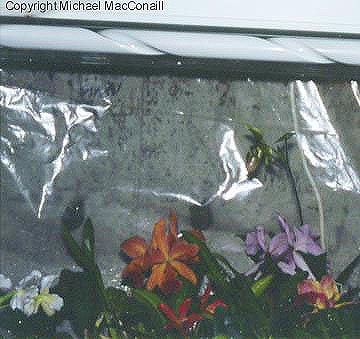I raise many of my orchids under lights in winter. Here we see part of a bank of eight x 4' wide spectrum tubes that are used to illuminate the larger plants. On either side are light stands under which I grow more compact specimens.. From October through to March, day ength is adjusted to 12 hours, while at other times of the year it is set at 16 hours. Plants stay beneath the lights from about October until the end of May.