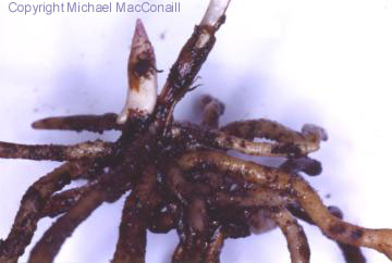 perennating bud and what environmental conditions affect the formation of flower buds within it. This perennating bud was harvested in August and already contains flower buds for the following July blooming season. Insufficient rain in August+September or too much rain in the following May could cause the abortion of the flower buds.