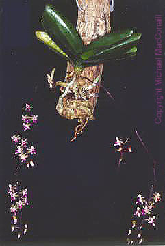 I was surprised with this orchid winning a CCM. Fortunately, I had groomed it well before the show. Sarcoglyphis pensilis ‘Delight' CCM/AOS can be a challenge to grow well. Just when you think you have gotten it right, a leaf yellows or flower buds dry up. I grow the plant on a mount and keep it very well watered when roots grow and infloresences appear. Water quantity is critical as any withdrawal of water at this time results in aborted infloresences. When the plant is not growing, it is quite tolerant of dryness. I grow it warm at 70-75F by day or even warmer in summer. It loves warmth and responds with a fresh batch of blooms. Flowers individually last only a week but the plant flowers 2-3 times annually.