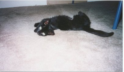 Meow! Dat was a nice nap *YAWN*. Hope bean open Whiskas soon.Anyway, on with the story.So my mom and sisfur were gone and I was all alone. I not like it at all! I hated them d*gs so close and barking! I begain to think no bean would want me! I tried evfurything cute to get their attention and they all pass me by. I heard other cats meow dat black cats arn't furry popular with beans.I not understand diss.Then one day there came a bean that was looking for her lost kitty.She took one look at me and I knew I had found my human!. I was so so furry happy to get out of there! I have now been with my bean for over 6 human years and am so furry happy.