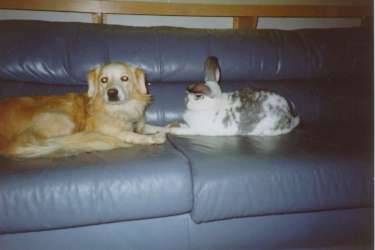Never thought I would see a dog and rabbit getting along : This is Sandy the d*g and U-Chan the bunny.They are furry specail friends that I have knowen for a furry long time. They are always good for a laugh )
