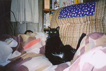 And dis be Ebony!! The cat with the most beautiful eyes! She the Queen and Boss Cat of the household. She smack Abby around at least once a day to keep her in line. And when no one is looking,she gives Abby a bath and some headbutts.We meow lots on icq. It furry fun