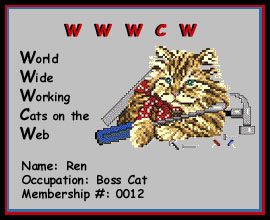 Being half Burmese,Ren has quite the personallity.During the day a window is left open for him and the other cats so they can go in and out.At night they all stay inside.Whenever Ren comes home from chaseing birds and lizards, he comes up to the window and anounces his presence! He demands quite loudly that it is time for his Whiskas which I have to bring over to him and place on the table by the window.He also likes to eat his Science Diet there too.Next it is cuddle time. Ren is the ruler over the 13 other cats of my household.He makes sure that everyone shares the toys and catnip and that no one eats out of his specail food bowl.Anyone caught gets a great big HISS..and SWAT!! and their catnip privlages are taken away for the rest of the day. Ren loves to sneak into other peoples houses!One time he got locked in my neighbor's place.They were going out of town and didn't see Ren go in.That night when I called for him and he didn't come I began to worry.I searched everywhere and just as I was begining to think the worse I heard this meow coming from my neighbors place.I went to the window and there was my Ren!Lucky for Ren I was able to get him out.