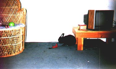 Meet Antonio the rabbit who lives with 14 cats! He and Lucky love to play Hide & Seek togeather.They also fight over who gets to play with the little orange ball that they both enjoy tossing about.Antonio also likes to chew on wires.I'm working on "Bunny Proofing".