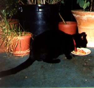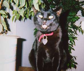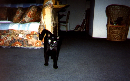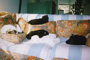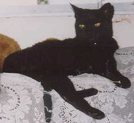 Jan 1998..The other nite when me and my bean were sleeping on the couch in front of the TV,we were suddenly awakened by the sound of Lucky hissing and grawling.We look and there is the Racoon inside the house!!! Meow does he have some nerve!! comeing in my house and eating my food!! Brave Lucky smacked him right in the nose! Bean was so sure that Mr Coon would tear Lucky apart but he didn't.He went back outside and after putting some food out for him (silly bean felt sorry for him!) bean shut the window so he couldn't come back in.School started again!! I so so furry happy!! I like all the silly humans.They always pet me and scrach my ears :) I really like going to school so after a good power nap