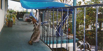 Well I got in furry big trouble!! I wondered too far the other day and couldn't find my way back home. My human had been looking ebfurywhere fur me and was getting worried..I found myself at a hotel by the beach and when I meowed at the humans there to help me they got furry mad.They weren't nice humans at all.They called the nasty Animal Control man and he came and got me. I had to go fur scarey ride in his truck. He took me back to his office and called my human at work. Good thing he happened to be a friend.I was so so furry happy to see my meowie and get home that I didn't even mind when she told me I could never go outside again and that I was in big trouble. I knew she wouldn't stay mad at me fur long.By the end of the day she gave me tuna and told me I was a good kitty.
