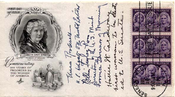 FDC signed by Eleanor Roosevelt, Nellie Tayloe Ross (first female governor), and Hallie Caraway (first woman elected to the Senate)