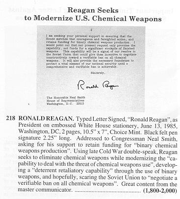 Speaking of autopens, UACC members recently received a mass-mailing of an auction catalog presented by "Early American History Auctions, Inc." If you have this catalog, take a look at page 48, item 218 (or click here to view.) It is a TLS of Ronald Reagan to a congressman as president, with an auction estimate of $1800-2000. Now, take a look at my autopen page (in the top right corner.) This only serves to show that even good dealers make mistakes sometimes and one should always be vigilant in sorting authentic autographs from fake ones.