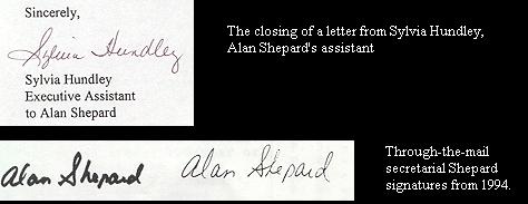 12/27/97--Mystery solved? In 1994 Alan Shepard's office began to fill some autograph requests with highly deceptive secretarial signatures. The signatures resemble Shepard's own autograph so closely that I was initially fooled by some of them, and since have seen some for sale as legitimate autographs in dealers' catalogs. Today I gained access to a letter written by Sylvia Hundley, Shepard's executive assistant. I have scanned her signature side-by-side with secretarial sigantures sent in 1994. What do you think? You can also view an authentic Shepard signature for comparison here.