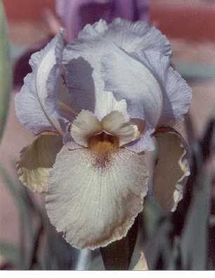 Leah Ralls Hunt, 1984 Pale blue-white standards veined light blue. are rimmed in blue-violet. Greyed-yellow falls are dotted with brown, and marked with brown stripes around the have a rich rose-violet blush around the grey-poupon beard. From Capitola X Dawson sdlg: Sylphide x Kalifa Gulnare). No pollen, but an excellent pod parent. For Show aficionados, the ASI code is OGB.