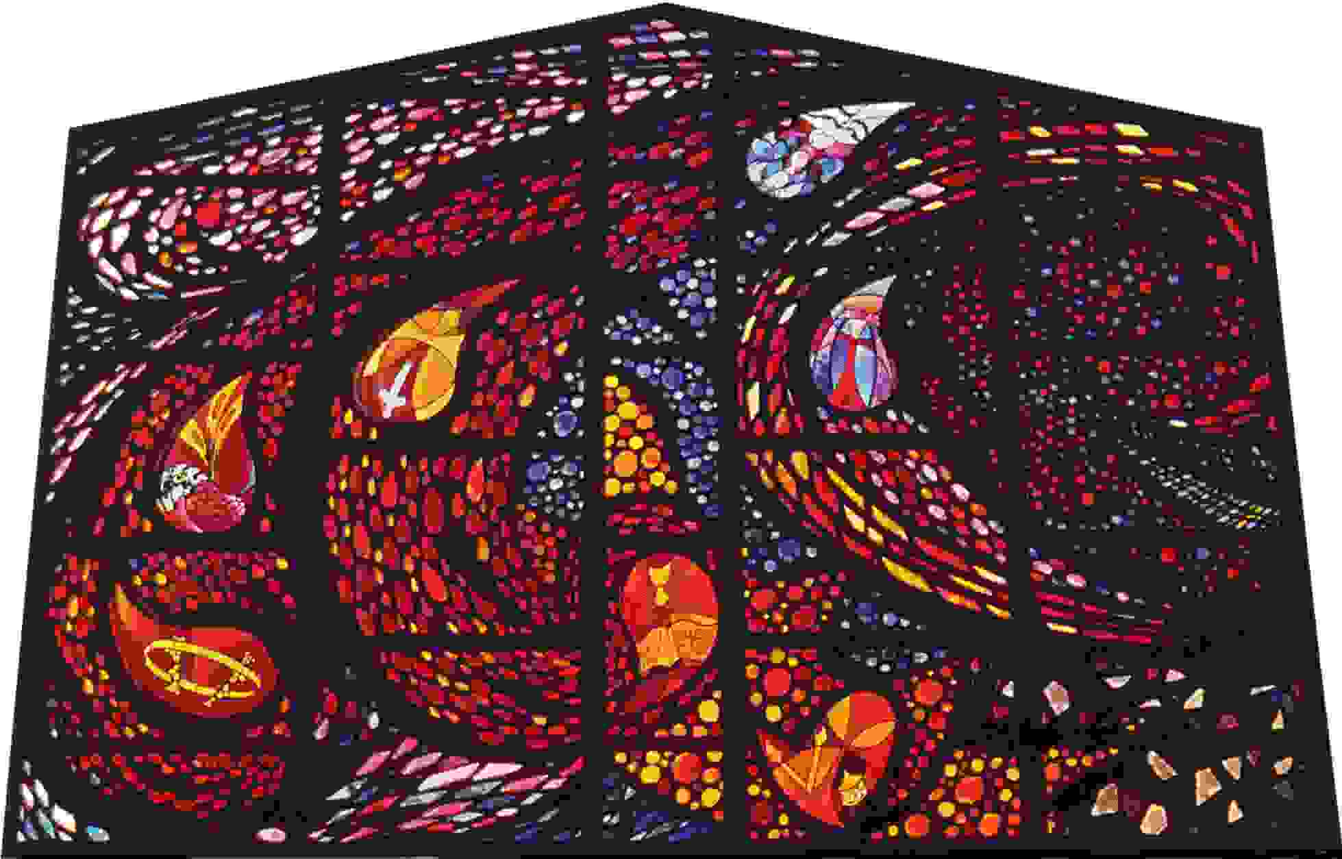 Grace, or the seven Sacraments. Baptism, which makes us Christians and children of God and gives us the first participation in the Priesthood of Christ is at the top. Immediately below is the sacrament of forgiveness, Penance, portrayed by the stole and key. The symbol in the bottom right side panel represents the sacrament of hope or trust, the beautiful Sacrament of the Sick. The center panel contains the sacrament of fuller participation in the Priesthood of Christ or Holy Orders. The highest symbol on the left side tells us of the sacrament of faith, Confirmation. The sacrament which nourishes the power of love is the Sacrament of Love, the Holy Eucharist, in the extreme left panel. Finally the seventh sacrament, the ring of crowns, is the Sacrament of Matrimony, also the Sacrament of Love. The Channels of Grace are with the Christian throughout life and, using the powers given through the Sacraments, grows through actions of love in beauty and strength of soul. |
