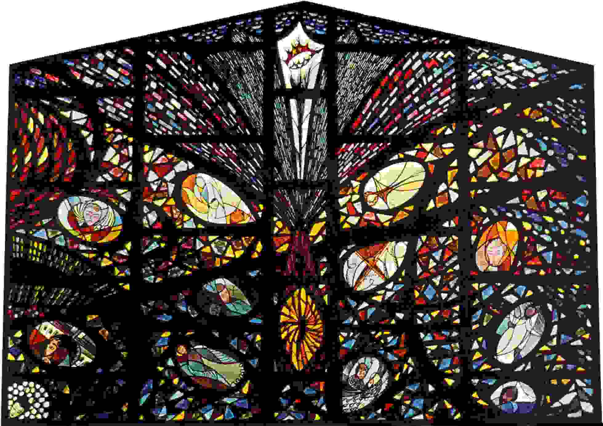 Graces. In this window, the first ordinary men surrounding the crown and the palm of victory are the Apostles. Beginning on the right side from the top are: St. James the Less, killed with a club; St. Simon the Zealot, a fisherman; and St. Jude, who traveled far and wide and is seen with the sail of a sailboat. In the next panel are St. Peter, nailed to the cross with head down; St. Andrew, tied to a cross in the form of an X; and St. James the Greater, portrayed with the baptismal shell. The figures on the first left side panel are St. John, writer of the Fourth Gospel, who was cast into a caldron of burning oil; St. Bartholomew with trowel, mason's tools and brick wall; and St. Matthew. In the extreme left panel are St. Philip, the travelling Apostle, with a cross and staff; St. Thomas, a carpenter; and finally Judas and his pieces of silver. Through the Church, God's Love reaches every corner of the world. |