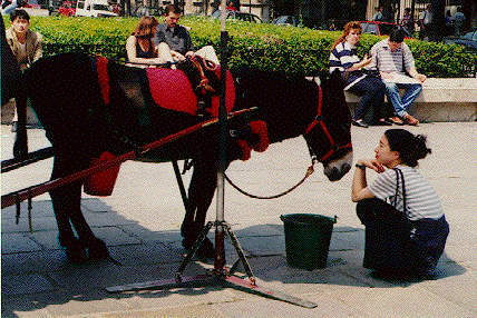 Hitched to a souvenir wagon in front of the cathedral, this donkey dozes in the unusually hot July sun. (photograph © 1995, Michael J. Valinis) |